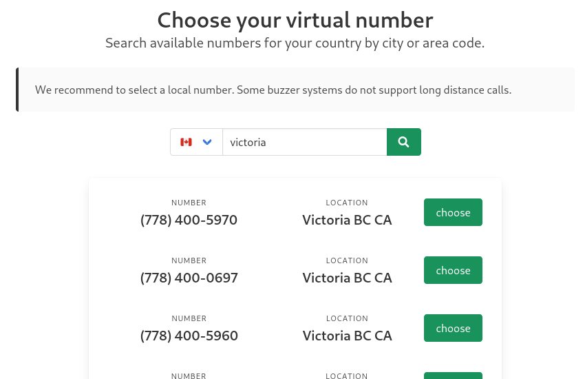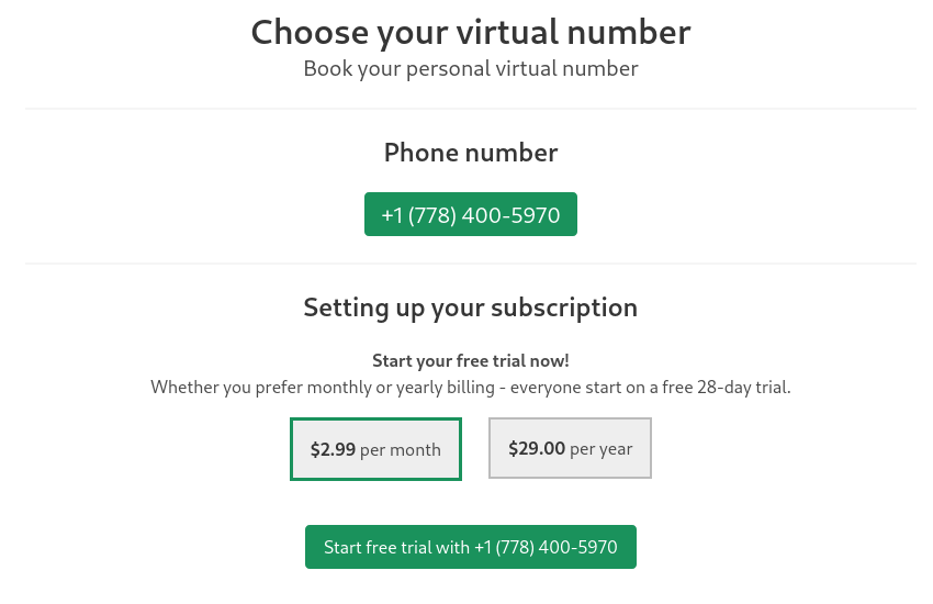 Search by city or area code and choose any number you like. Then start your free trial - choose between monthly or yearly billing (but you can always change you mind later).